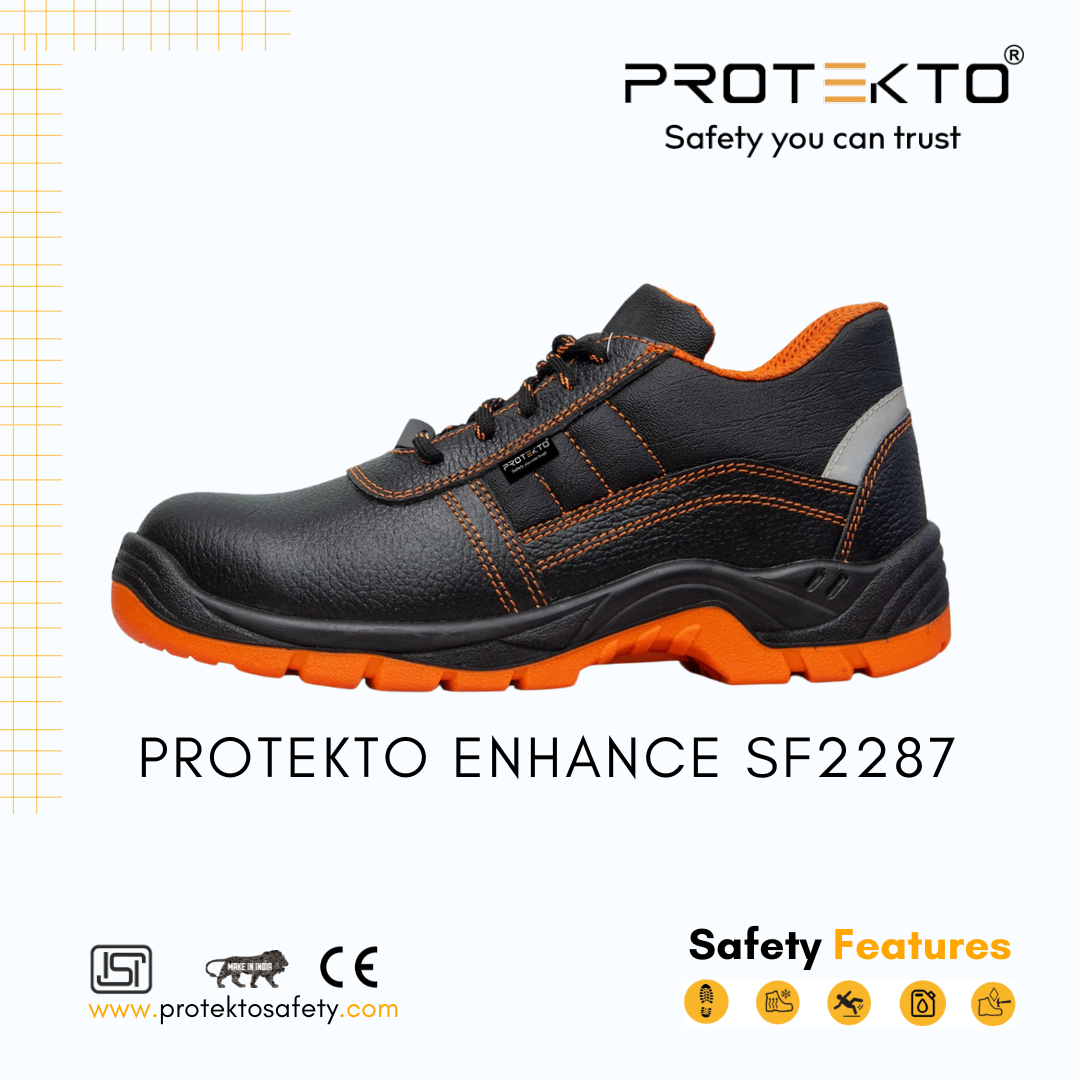 PROTEKTO ENHANCE SF2287 is a heavy-duty low-ankle safety shoe engineered for maximum protection, durability, and all-day comfort. Crafted with premium leather and a robust PU sole, this model is ideal for demanding industrial environments where safety and reliability are critical.